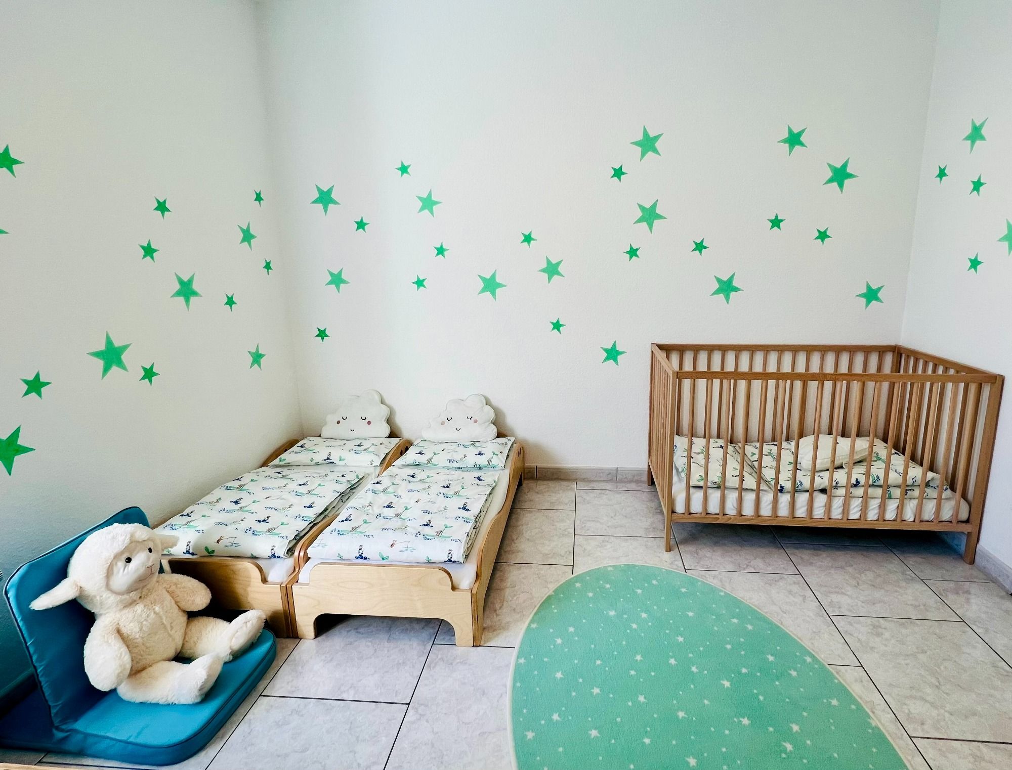 Die Betreuungsräume bestehen aus Eingangsbereich und Flur, einem Spielraum, einem Schlafraum, einem Badezimmer und einer Küche. Im Eingangsbereich befindet sich die individualisierte Garderobe der Kinder. Durch den hellen Flur gelangt man in den großen Spielraum, in dem gespielt, getobt, gebaut, gegessen und gebastelt wird.